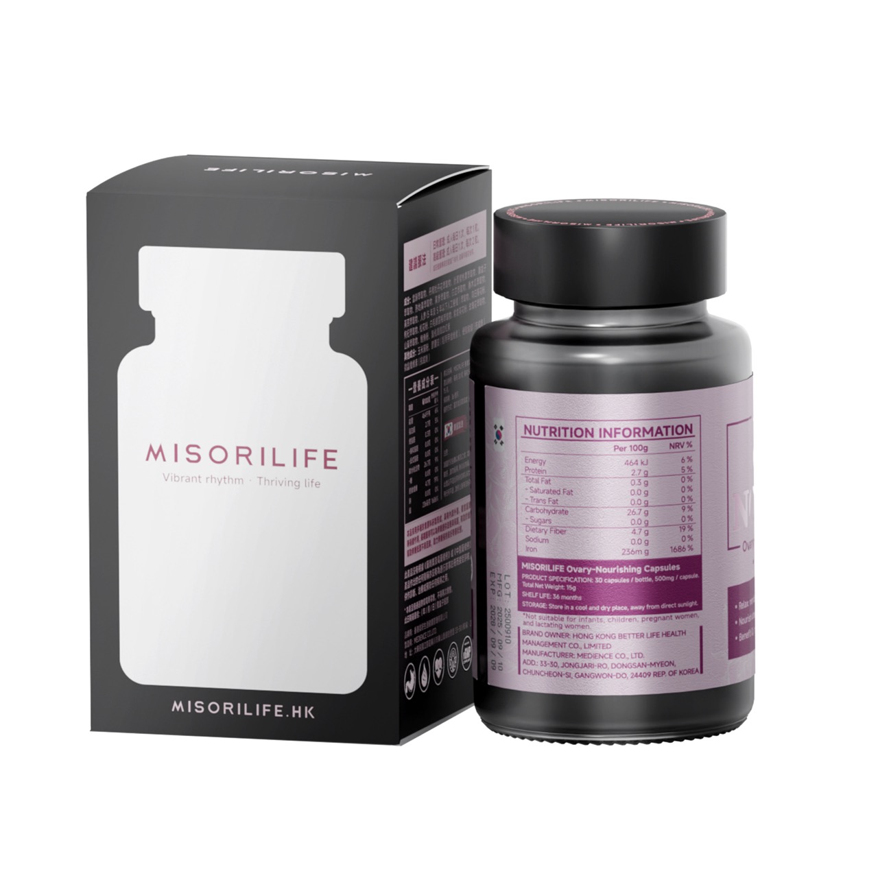 规格:1瓶/盒,30粒/瓶,500mg/粒(每粒含 草本提取物:当归、丹凤牡丹花、针叶樱桃果、覆盆子、熟地黄、党参、白芷、番木瓜、黄芪、人参、玫瑰花、山药、枸杞;向日葵花粉、松花粉、白毛银露梅、紫云英花粉、鲑鱼粉、氯化高铁血红素)